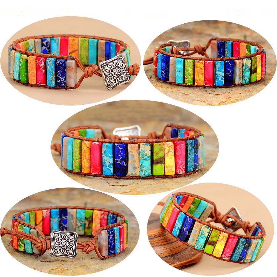 Chakra Bracelet Jewelry Handmade, Multi Color Natural Stone Tube Beads, Leather Wrap Bracelet Couples